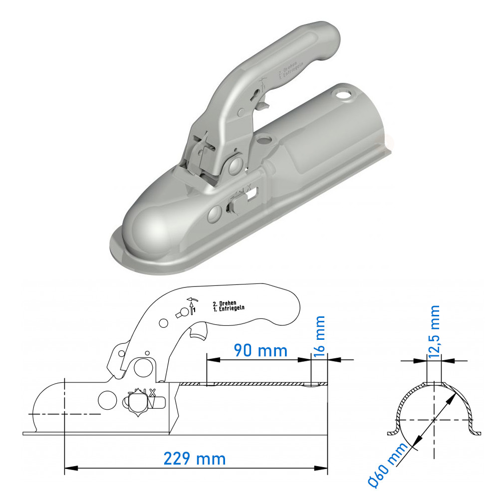 [table]Húzó teherbírás: 1400 kg|Felszerelési profil: kerek|Vonórúd átmérő: 60 mm|Teljes hosszúság: 27 cm|Rögzítés: 2x függőleges M12|Furattávolság: 90 mm[/table]